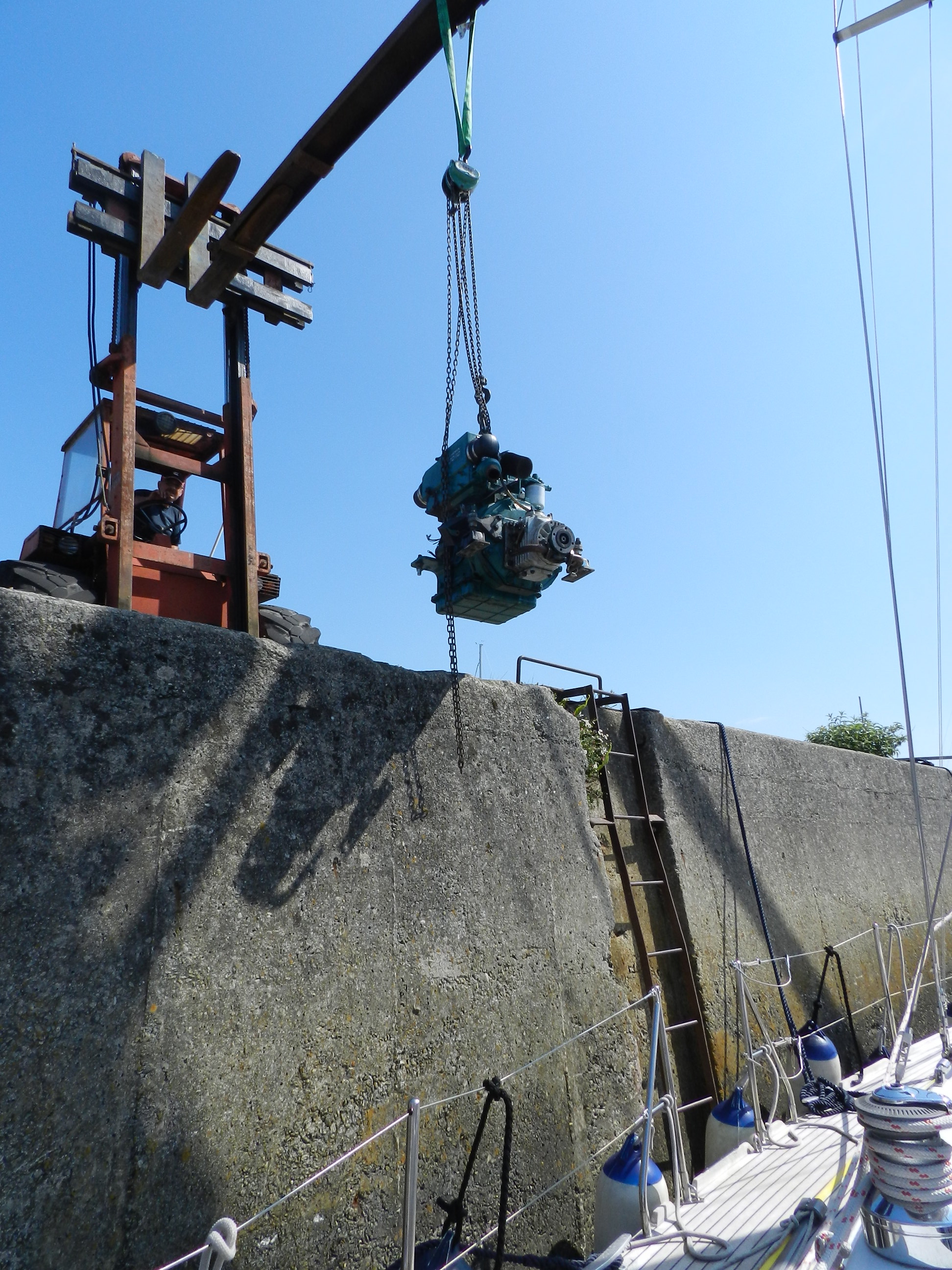 So, with the bank holiday over, a phone call to the engine people was made this morning to check that they were coming to remove the engine to their workshop. Speaking to the owner, he said that probably at 1100 they would come and move it but he had to make a phone call first. At 1100 the berthing man from the harbour office turned up in his dory (it’s like a rib but solid) to move us to the slipway so that we could tie up against the wall and they could then bring a fork lift truck to the edge and lift the engine out. It then became clear why 1100 as it was high water at 1200 so would give us enough depth to get there and back into our berth.