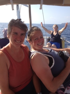 Pictures of Jo, Joey and Yvonne sailing, the bay in Carbonara.