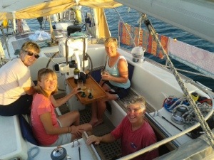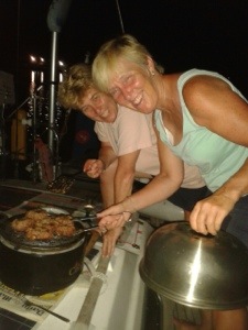 Once again a lovely breakfast enjoyed on deck in the beautiful sunshine. Had to hoist Liz Wall up the mast to stop her running off to the local beach bar disco! Meanwhile, we spent our time diving to take a look at the fish, giant clam and retrieving various objects! (Sorry about your camera lens Ali!). Had ten knots of wind so were looking forward to a sail again, but sadly after raising the sail wind dropped to 4 – So once again the team were thwarted at being able to show their great racing team potential.