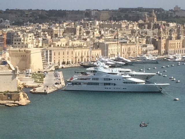 This was built by the Knights in the 16th Century and saw service right up to WWI, including the Crimea and Dardanelles campaigns. The wards were up to 150m long and could care for over 900 male patients at a time – women apparently didn’t get sick! Then we went to the Upper Barrakah Gardens for an ice cream and to take in the views across Grand Harbour. Spot the helicopter on the back of the super yacht!