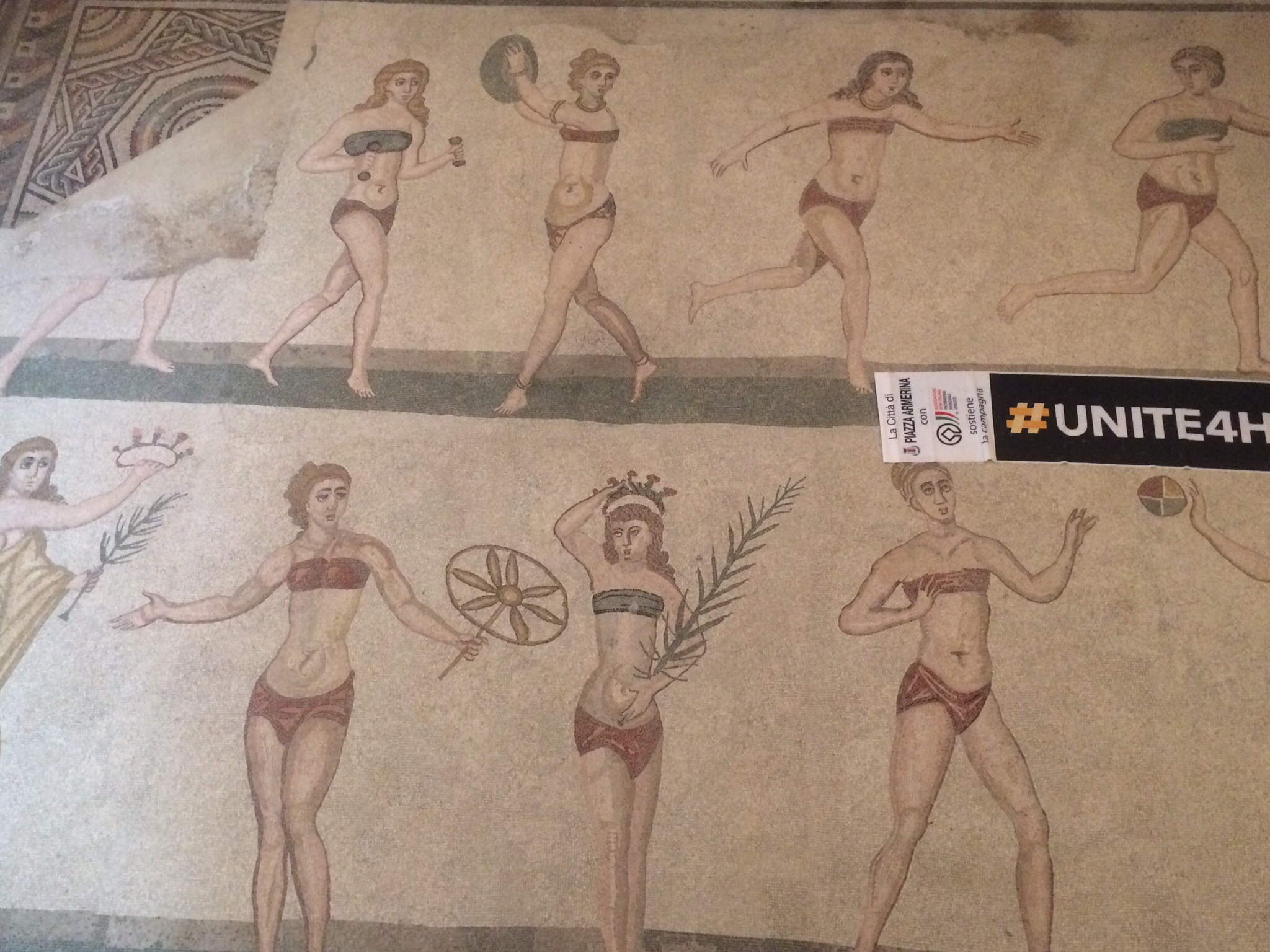 After a fairly lazy morning, we continued our tour of Southern Sicily and set off on a two hour drive to a Roman villa near Piazza Armerina where there is the most amazing mosaics. The vast majority of the floors in this large villa have intact mosaics – apparently the largest single collection anywhere. Quite extraordinary. One of the most amazing was of ‘Bikini women’. I’m not sure I’ve seen mosaics before depicting women doing sporting activities. It was well worth the drive. It’s a shame that there was a banner promoting Sicilian heritage across the floor.