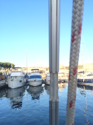 On way to the supermarket we decided to stop for some brunch – after all, we are on holiday (sort off). Food bought including ice and it was now time to start the long list of jobs. First up was putting the Genoa on. This is one we bought secondhand before we left the UK in 2012. We had had it valeted last year and packed it away. We decided we would try it this season as it’s bigger than our usual one so should be better in the lighter airs you can get in the Med. First of all, though, we needed to unfurl the furling line and wind it in anti clockwise rather than clockwise as the UV strip was on the other side to our usual one so would have ended up not on the outside when the sail is furled which kinda defeats the object of the UV strip. Once we had done that we were ready to put the sail on. Except that the cord on the luff of the sail was too big for the groove! So it will be back to the sailmaker to have a smaller cord fitted, which was a shame as we were hoping to have at least a day sail tomorrow to try out the new main and new to us Genoa.