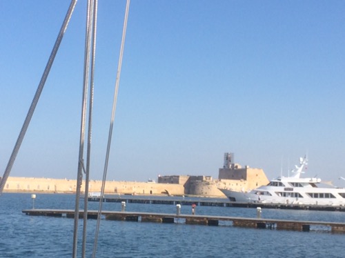 After a week in the UK, we flew back to Brindisi this morning. The temperature has risen since we left and at 5pm it’s 32 degrees. With very little wind that makes it quite warm – especially since home was 13 degrees this morning! Whilst we were away, the wind was from the south and east, perfect for making our way up the coast to pick up Michael in Bari and onwards to Venice. Of course, now that we are back, the wind is going round to the NW (where we want to go) and picking up in strength so making any headway can be quite difficult. That is the sailor’s lot. I suspect that we will stay here tomorrow and sort out various bits and bobs on the boat (the list that never finishes!) and leave early on Friday morning.