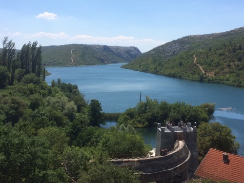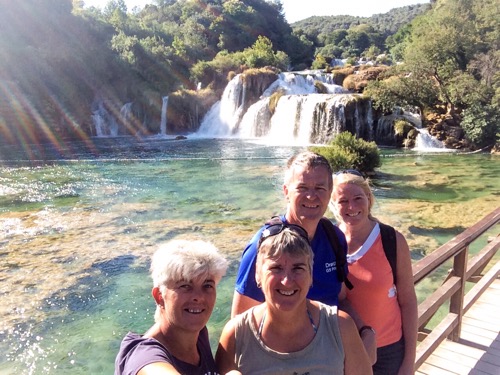 The forecast was showing that a Bora was due in and wherever we were by Saturday afternoon, we would be stuck in for at least two days so we hightailed it out of there towards Šibernik on the mainland. We had a glorious sail with a fully reefed mainsail (made it as small as possible) and a bit of genoa out. We touched 7 knots at times and the waves weren’t too bad as we sailed between the islands. The reason we wanted to head towards Šibernik was to go inland for 10 miles up the river Krka to Skradin as it was the closest we could get the boat to the start of the Krka national park and its waterfalls. It was a lovely meandering cruise up river, under bridges and by lush riverbanks. The wind didn’t abate as we approached so mooring was difficult but with four of us, no damage done to us or anyone else. There were a lot of boats seeking shelter from the bora here including Dream, a 60m super yacht that can be chartered from a mere €370,000 per week complete with a crew of 15!