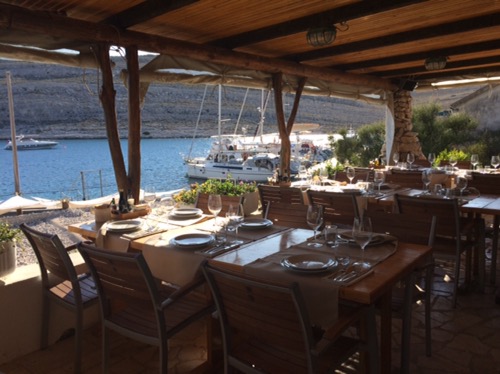 Friday morning dawned with lighter winds but enough to sail or so we thought! We were headed for the southern tip of the Kornati Islands, another national park. These islands have been described as looking like a moonscape as it is so barren. Apparently the Venetians stripped these islands of their trees and destroyed the topsoil so hardly anything grows here now. Not so much beautiful as interesting. We ended up motor sailing and the bay we stayed in is called Opat with a small jetty and a fabulous restaurant. Ingrid and Jan Olav treated us to a sumptuous meal there of freshly caught John Dory and lobster.