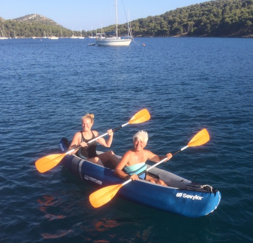 After a lovely peaceful evening in Soline, we motored 10nm to the Telašcica National Park where the mooring buoys are free but they charge you around £50 to enter the park! Still, it was a beautiful place to sit out a blow. Ingrid and Liz tried out the repaired kayak.