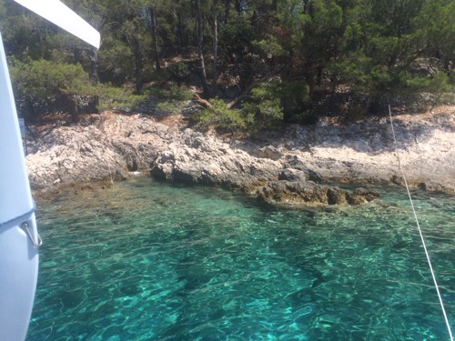 We got back to Nimmie and had just settled down to sleep – some on deck and some below (it was still so hot!) when the electrical storm started, very spectacular sheet lightning and soon the predicted gusting wind started up. We watched the lines to shore anxiously as the gusts went up to 25 knots, then 30 knots, then 35 and hitting 40 knots. But thankfully all held! Not so for those around us – we can only describe it as carnage! Many boats gave up as as anchors dragged and they motored further out in the cove, some tried to re anchor and one boat (‘next door but one’) ran aground on the rocky shore. It was a very hectic night! The wind and lightning eventually receded and next morning was lovely – calm and sunny! Breakfast versus the wasps – the wasps won and we decided to move on, but not before Jo went diving to retrieve the mask and snorkel dropped by Sheila the day before and also to look at the keel with a view to giving it a clean. A tense 20 minutes for all bar Jo, as a number of boats came in to the cove and Sue and Sheila struggled to maintain the role of indicators of ‘diver below’ (normally carried out by orange inflatables attached to the diver!) The mask and snorkel from the bottom of the cove (6 metres) were retrieved and Liz’s adrenalin levels eventually subsided!! An orange inflatable was purchased next day!!