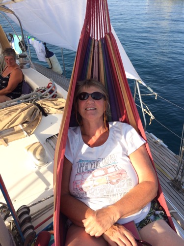 We got back to Nimmie and had just settled down to sleep – some on deck and some below (it was still so hot!) when the electrical storm started, very spectacular sheet lightning and soon the predicted gusting wind started up. We watched the lines to shore anxiously as the gusts went up to 25 knots, then 30 knots, then 35 and hitting 40 knots. But thankfully all held! Not so for those around us – we can only describe it as carnage! Many boats gave up as as anchors dragged and they motored further out in the cove, some tried to re anchor and one boat (‘next door but one’) ran aground on the rocky shore. It was a very hectic night! The wind and lightning eventually receded and next morning was lovely – calm and sunny! Breakfast versus the wasps – the wasps won and we decided to move on, but not before Jo went diving to retrieve the mask and snorkel dropped by Sheila the day before and also to look at the keel with a view to giving it a clean. A tense 20 minutes for all bar Jo, as a number of boats came in to the cove and Sue and Sheila struggled to maintain the role of indicators of ‘diver below’ (normally carried out by orange inflatables attached to the diver!) The mask and snorkel from the bottom of the cove (6 metres) were retrieved and Liz’s adrenalin levels eventually subsided!! An orange inflatable was purchased next day!!