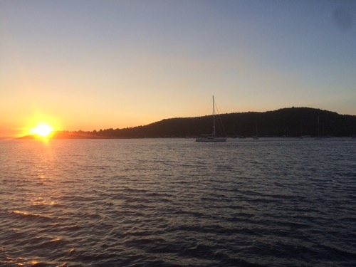 We left our friends, Sue and Sheila, to continue their holiday in Croatia on the Saturday morning whilst we re-provisioned and cleaned the boat. Zadar is a lovely town with great restaurants and a maze of little alleyways to explore. We were moored slightly out of town in Marina Borik as the main marina is full at the weekends due to the charter fleets that operate out of it. We left Sunday morning around midday and made our way over to Preko to refuel. We had hoped to change our cooking gas bottle but the chandlery was shut and the fuel berth only had small ones. We wanted to make reasonable headway down towards Trogir so we sailed down to Otok Murter. By the evening the wind has really blown up so we wanted a large safe anchorage with good holding.