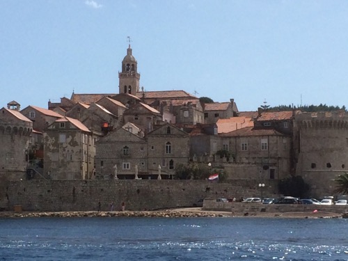 We did indeed spent another day in Vela Luka on Korčula island during which the heavens opened several times. Truly torrential rain but it did mean that the sea had a chance to calm down a bit. So, on Tuesday morning, we topped up with fuel before setting off for Korčula Town, some 35nm away where the rest of our club charter were. As always, the wind wasn’t quite coming from the direction they forecast so it was bang on the nose and the sea state started to build again. However, once we were in the channel between the Pelješac peninsula and Korčula island, it was a lot flatter and easier. We sailed past the old town into an anchorage just two miles south to meet the other boats only two days late!