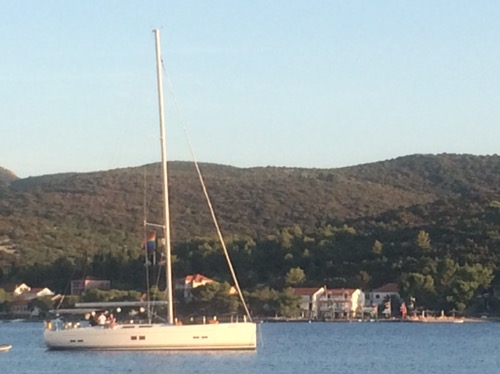We spent the night in a quiet anchorage and walked round to Lumbarda village to eat in one of the many restaurants. It was an okay meal but lovely to be with everyone. We spent the next day wandering around Korčula as it was only a couple of miles in the dinghy and yacht Limoni gave us a lift one way! After Korčula we had a fabulous sail up the channel to Loviste on the Pelješac peninsular. It was a huge but quiet anchorage (at least until we turned up!). We had fabulous drinks and canapés on board Artmedia, a Hanse 575, with loads of toys including its own wine fridge, electric height adjustable tables and the necessary generator to power all these luxuries!