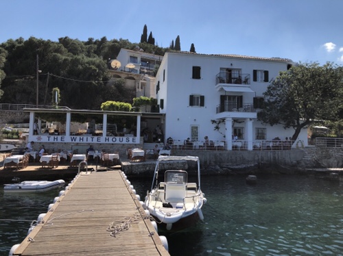 We made our way to the east side of Corfu to Kalami Bay where Lawrence Durrell had a house. The wind was very light so we motored the whole 4 hours. The bay was pretty full and we would have had to anchor in quite deep water so we decided to go around the corner to O. Agni. It was a delightful bay. We anchored and then took lines ashore using our new webbing. Our neighbours were Aussies who were very entertaining and quite good guard dogs when we took the dinghy round to the Durrell’s White House in Kalami for a drink. It has been beautifully renovated and has lots of quirky touches to reflect its heritage.