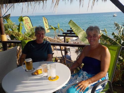 Finally, we left Lixouri. It was so easy to just idle our time away there with everything we needed without any charges in the company of friends. However, we had places to visit if we were going to get to Athens by mid October! We had spent Monday catching up on admin (work and personal) before casting off around midday on Tuesday. It looked like we would have a lovely sail but, of course, the wind was on the nose until we got to the head of the bay and then pretty much died. Motor on, we continued anti clockwise around Cephalonia along the south coast to Lourdas beach. Rob and Lisa had said how nice it was and it even had a beach bar. We kayaked over and had lovely views back towards Nimmie whilst having a drink at the Waikiki bar.