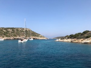 Refreshed, we left Sunday morning to go onto the peninsular of Methana and the little harbour of Vathy. It’s now very popular with flotillas so we were hoping that Sunday would be a quiet day. There was no wind so we motored all the way round (some 20nm). When we arrived, there were only 3 boats there so we tied up to the quay and met our neighbours, 3 Australians with another Westerly boat, a Westerly 490.