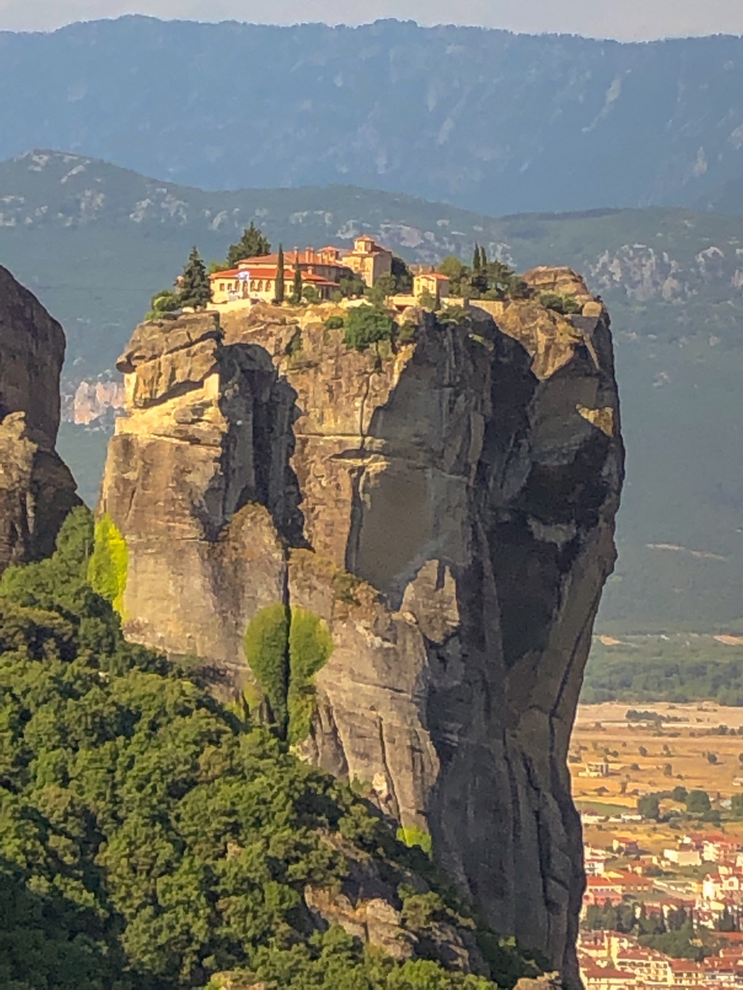 We hired a car for 5 days and in that time covered 1500 km of mainland Greece from Lavrion in the south up to the Vikos Gorge in the northwest. Our first stop on the Wednesday was the town of Kalabaka so that we could visit the monasteries of the Meteora. Meteora means suspended in mid air, a very apt description! These monasteries were built in medieval times on the top of rock pillars, looking over a fertile valley. You can now access them via steep steps but before the 1920s, access was via rope ladders or baskets. Quite stunning. We arrived in the late afternoon after the five and a half hour trip and were rewarded with a sunset and only a few visitors – the coach parties having long gone.