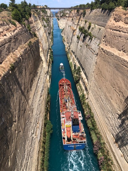 By now, it was Sunday morning and we, sadly, made our way back to Lavrion. However, we had a few more stops to make. First was the Corinth Canal. It is 4 miles long and a shortcut from the Ionian to the Saronic Gulf bypassing the long boat trip round by the Peloponnese. We were lucky to see a ship transiting the canal just after we arrived. It really is a major feat of engineering.