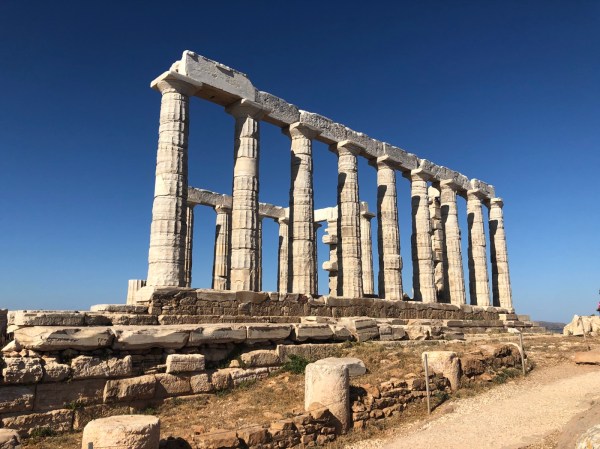 Our final stop before returning back to Nimmie was the Temple of Poseidon at Cape Sounion, just south of Lavrion. It was blowing a gale whilst we were there but it was still very impressive. The temple stands on the hilltop and can be seen for miles from the sea. We took advantage of having a car and ate out at a very nice taverna near Sounion as our road trip came to an end.