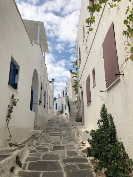 We’ve spent the last week on the lovely island of Paros as northerly winds were forecast for the following ten days and we wanted to be here so friends could join us from the U.K. As you will have read in our last post, we could only stay in the harbour until Friday morning and then try to get back in on Sunday due to a charter fleet being based there. We used being on the quay wisely as it meant we had electricity and water so could get through the maintenance jobs, do laundry, pay the Greek Cruising tax and wash the boat as she was encrusted in salt. We also took the opportunity to hire a car and tour the island for a day. We went to the medieval capital of Lefkes with its narrow streets and lovely shops, to Naoussa in the north that had a feel of Mykonos about it and a variety of beaches with beach bars and amazing rock formations (Liz’s idea!). It really is a lovely island so there are worse places to be storm bound.