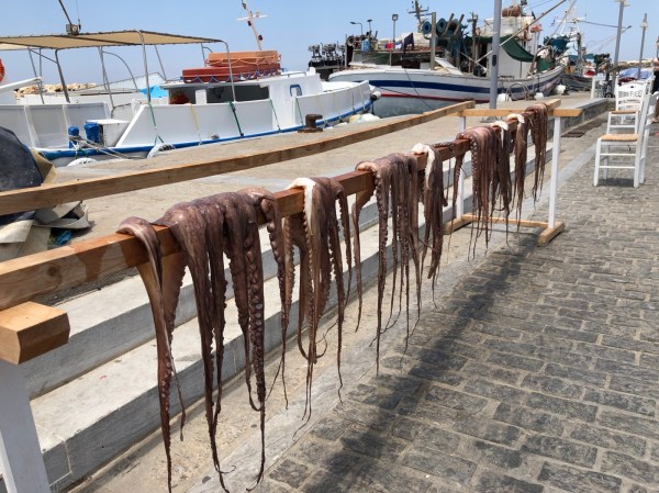 The next morning, Sunday, the breeze got up around 9am and no boats had left. We had gusts of 30 knots (34 mph) as we were waiting to nab a prized spot inside the harbour. There were spaces on the outside but they would have meant that the waves and wind would be pushing us onto the concrete quay and that’s without the wash from the huge number of ferries that come in and out of Paros every day. Finally, two boats left the inner part so we knew there was space. Despite the windy conditions we decided to go for it as the forecast was for the winds to increase and stay high for the next 5 days so it was now or never. As we approached, the wind dropped to 18 knots and Nimmie behaved beautifully so we slipped into one of the free berths with no drama at all. The last free berth was taken ten minutes later and that was it for the rest of the day. No one was moving anywhere! The wind seems to be slightly less in the inner harbour and certainly no swell or ferry wash so we were very pleased with ourselves. The wind increased throughout the afternoon and various boats came in to find sanctuary but they had to go onto the outer wall. It was carnage as some boats didn’t put enough chain out for the high winds so either got blown sideways onto other yachts or hit the concrete quay as the wind pushed them backwards. Now that we are in place for our guests, we can continue to finish our chores, relax knowing that, if we are storm bound, we can get off the boat easily and even tour around the island.