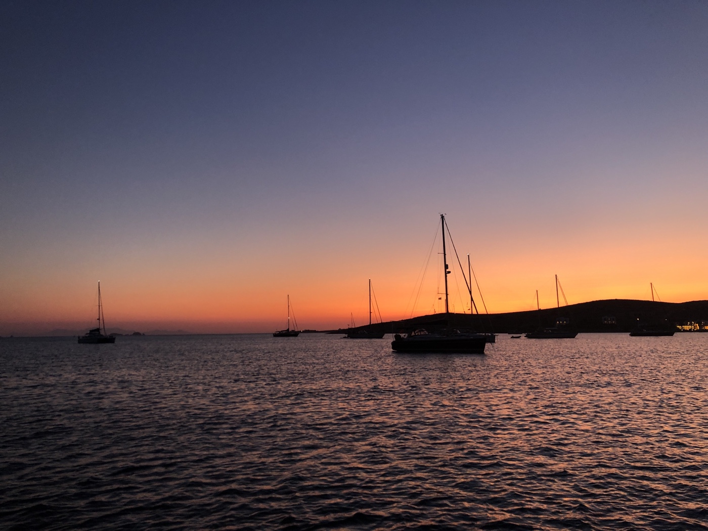 After a lazy morning and late breakfast we set off back to Paroikia. The sea was definitely lumpy out of the anchorage but once we got round the corner, the wind was behind us so we could sail most of the way back. Once back in the bay, we anchored in a spot that would give us a good view of the harbour and of boats leaving the next day! Liz went off on the paddle board to suss out the lay of the land (or harbour, in this instance) in preparation. The high winds of the day eased as the sun set and it was like a mill pond overnight.