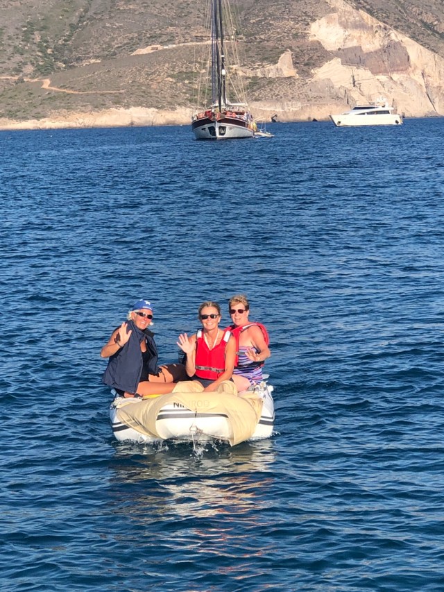 We came across Windhover again (who were in Paroikia) with Bernie and Sean on board. Our time there enabled us to see more of Bernie than we had expectedl!! Caves were visited 180 years after King Otto and Queen Amalia but on the way a turtle (named Timmy) popped up his head to say hello right by us in the anchorage. So absolutely stunning to see him! A first for us! Baby Nimmie also wanted an outing so we went in search of a sea arch. Just at the entrance to the bay we went through the arch and beached Baby Nimmie for a swim.