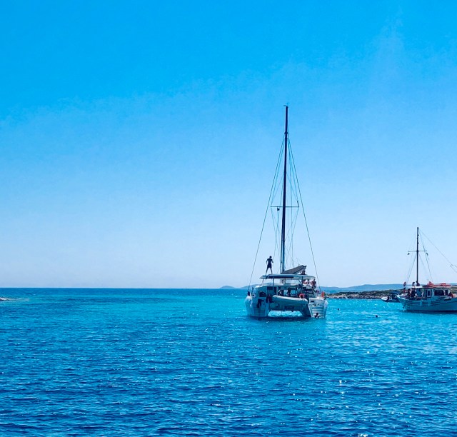 Back on Nimmie, watching the coast line, we saw a herd of goats being corralled by a donkey up the hill to their feeding station! Our trip nearing its end enabled us to see the most stunning turquoise sea we had seen with Ben helming us all the way.