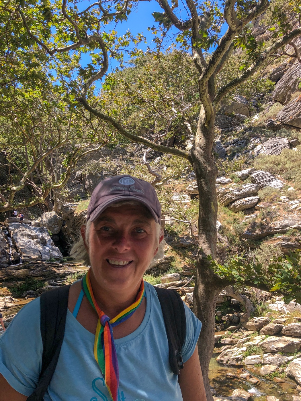 We didn’t manage to find a car for any sightseeing around South Evia although they did offer us a 50cc scooter but with the poor roads and high winds, we declined. However, we found a walking tour to the Demossari Gorge. This involved an hour’s coach journey along tracks and roads that were only just wide enough. God forbid anything coming the other way! We reached the start of the walk near the top of Mount Ochi and were almost blown off it by the strong NE winds. We then began our descent to the gorge. Despite being August and 35 degrees in the shade, the walk was beautifully shaded walking through trees.
