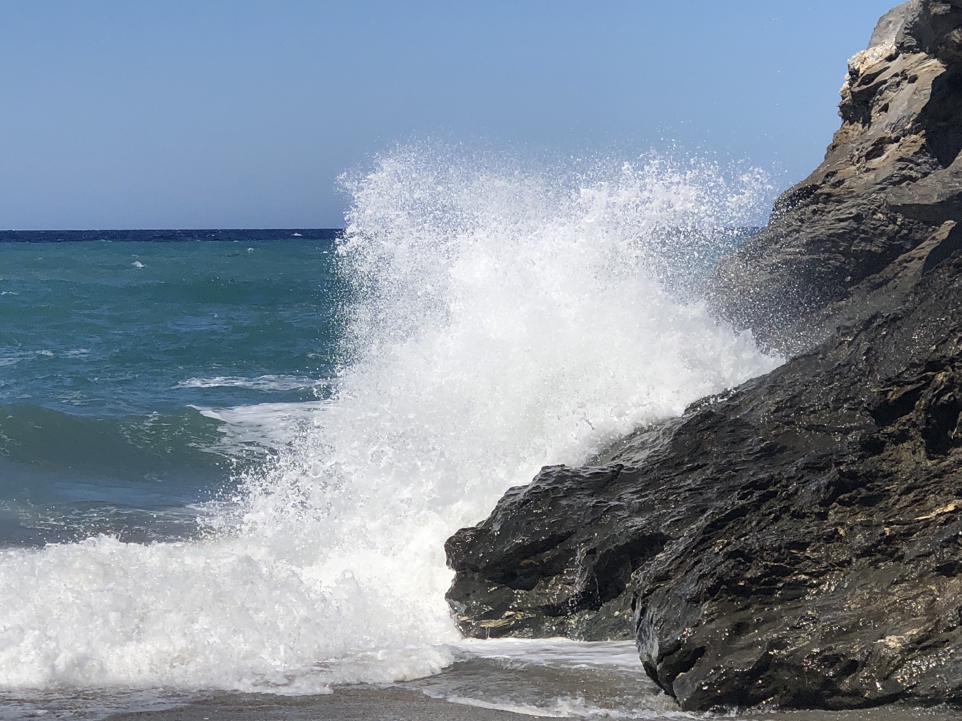 We finished the walk at an old chapel and were then whisked away in a converted van. The van could take ten people so there was a shuttle service. The way we were crammed into the van would be completely illegal in the U.K. but at least it was only for 15 minutes. We then deposited near a beach at Kallianou to get a well deserved cold beer. The waves crashing on the beach were spectacular but meant that we couldn’t swim in the sea.