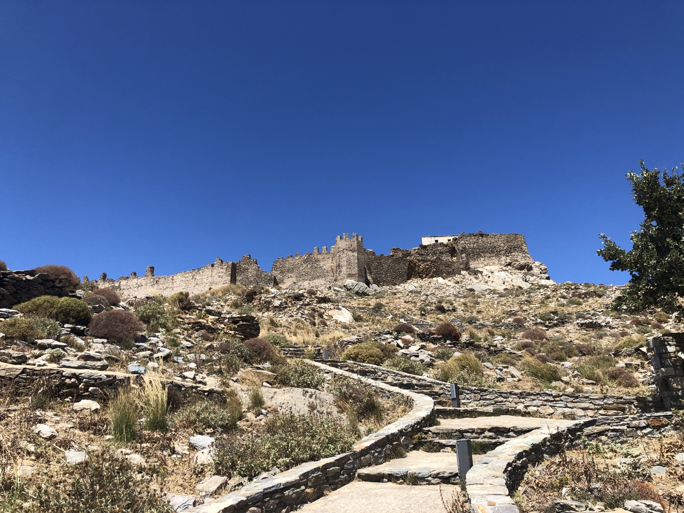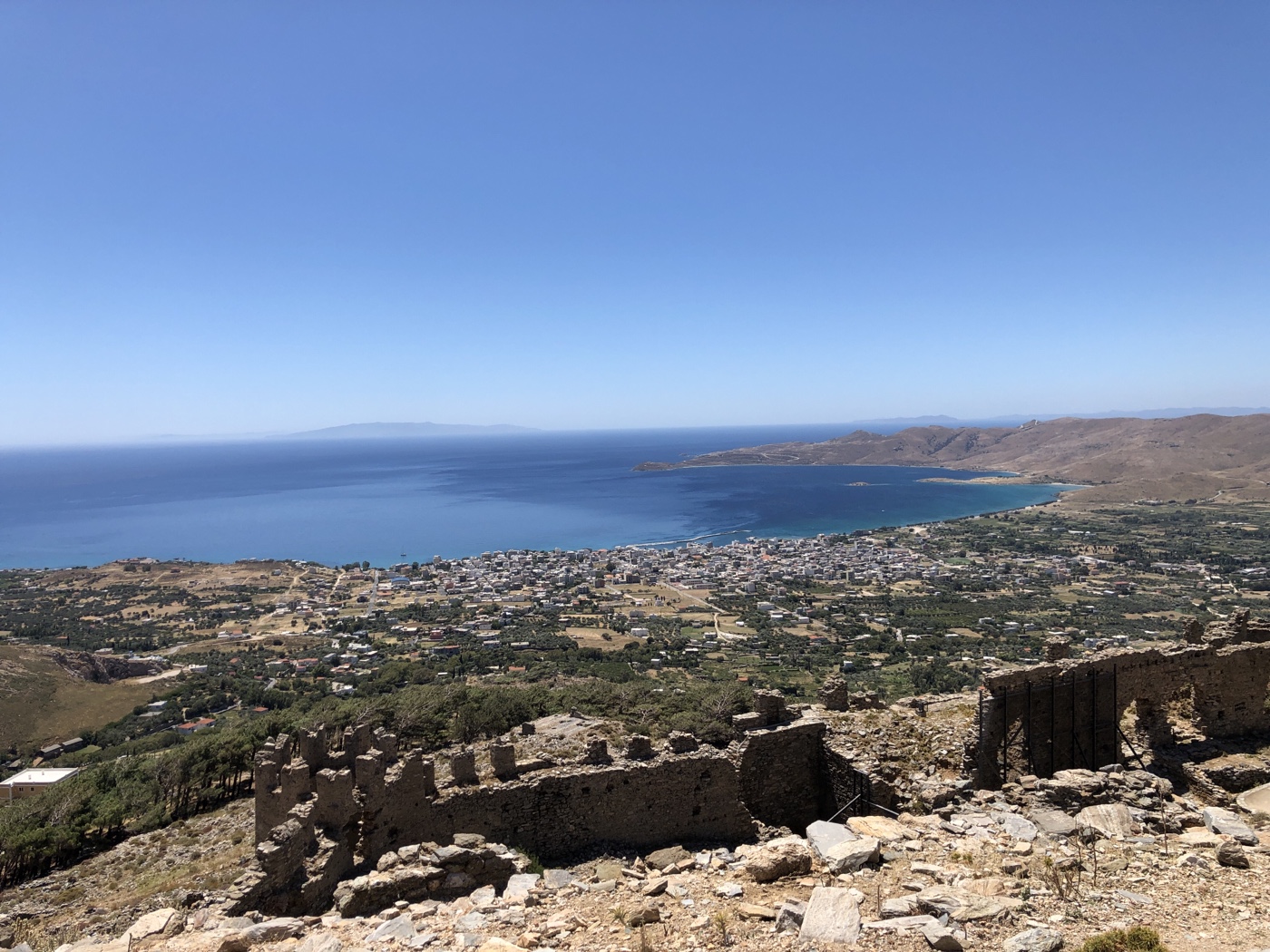 Back in Karystos we treated ourselves to a meal out as we couldn’t be bothered to cook and found a busy taverna, Cavo d’Oro, down a side street. €15 each including wine – bargain. The next day we were both a bit sore but decided the best thing was to walk it off. High above the town is a Frankish/Venetian castle called Castello Rosso that was built in the 13th century. It’s now a ruin but it does provide amazing views of the bay. We sensibly decided on a taxi there and to walk back as it was going to be another hot day and there would be no shade. Near to the castle is the village of Myli, a verdant oasis amongst so much barren rock. The village has a river running through it that’s fed by mountain springs. Crystal clear and very drinkable.