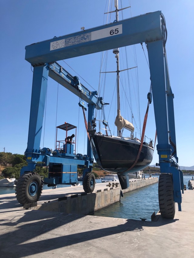 Back to Lavrion on the last ferry at 1830 to prepare for being lifted out Wednesday morning. The morning was still a bit breezy with winds around 20 knots in the marina so we had one of the marina staff on hand in case we needed them. In the event, all went well and Nimmie behaved perfectly. Once lifted, she was moved to the back of the yard where she is safely ensconced until next Spring. Once again, she has looked after us superbly in all weathers. It was sad to fly back that evening, especially to a fairly wet U.K.!