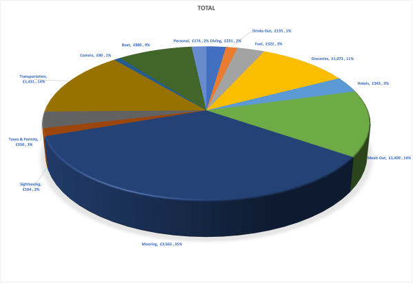 Running costs for the season have come in slightly higher than last year at £10,156 but this mainly due to the mooring costs at Olympic Marine (where we have taken a 12 month contract out due to Liz’s work commitments). We also spent twice as much on transportation which can be attributed to our road trip to inland Greece, car hire in Mykonos and ferry trips. Grocery costs were lower but that is probably because we ate more out due to the road trip and holiday in Mykonos.
