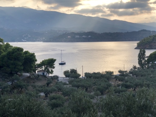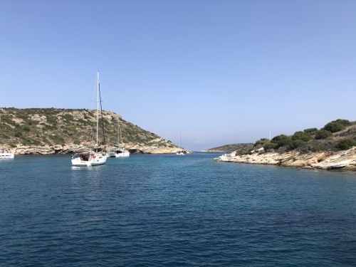 Afterwards we made our way ashore to explore. Sadly, the head of the bay was covered in rubbish. I suspect it was blown in whenever there is a strong northerly. So sad but something we have really noticed these last months. If a bay is not inhabited then the rubbish doesn’t get collected. We walked to one of only three settlements on the island. We did get a few strange glances from the locals but as soon as you said ‘kalispera’ (good afternoon) you got at least a nod back. The island has an inland seawater lagoon and a couple of other bays but otherwise not much. We settled in for a quiet evening knowing that the wind was due to come round to the North in the morning, which would make for an uncomfortable berth. Of course, this happened at 3am not 9am so by 8 we had enough and left for Aegina.