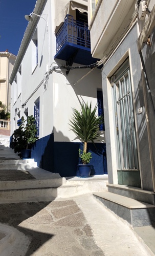 Our friends duly arrived on Sunday afternoon so we celebrated by eating out at a local taverna. Some of us had slightly sore heads in the morning! This didn’t deter us and we left Epidhavros mid morning to head towards the island of Hydra. Those of you who have been following this blog last year will know that Hydra Town is to be avoided at all costs due to the number of boats crammed into the small harbour. We anchored in a bay less than a mile walk away where we could swim in crystal clear water and have a peaceful night’s sleep. Some of our mini flotilla opted to go into town that night but we stayed on board to eat and have a quiet night to ourselves. We did venture into town Tuesday morning and it is as cute as ever but still bustling with tourists.
