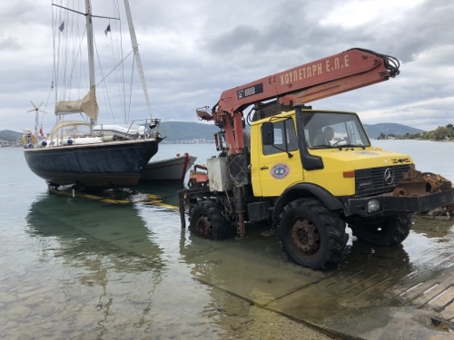 Next morning, we contacted the yard and they were ready for us so we carefully made our way to their slipway. The Koupetori yard uses the old fashioned method of hydraulic tractors to ‘lift’ you out rather than a travel hoist. This entails going alongside a barge to tie up with only centimetres under the keel and then the tractor with a hydraulic trailer is reversed into the water. Once underneath Nimmie, they lifted her up a bit, pulled her into the yard, washed her down (she was very clean so that didn’t take long) and put her into her supports. Whilst a bit nerve racking, it was all done with the minimum of fuss and took less than 30 minutes. The yard used to make wooden boats but when the Greek fishing industry collapsed they turned their hand to providing yacht services. It’s been a family business for three generations.